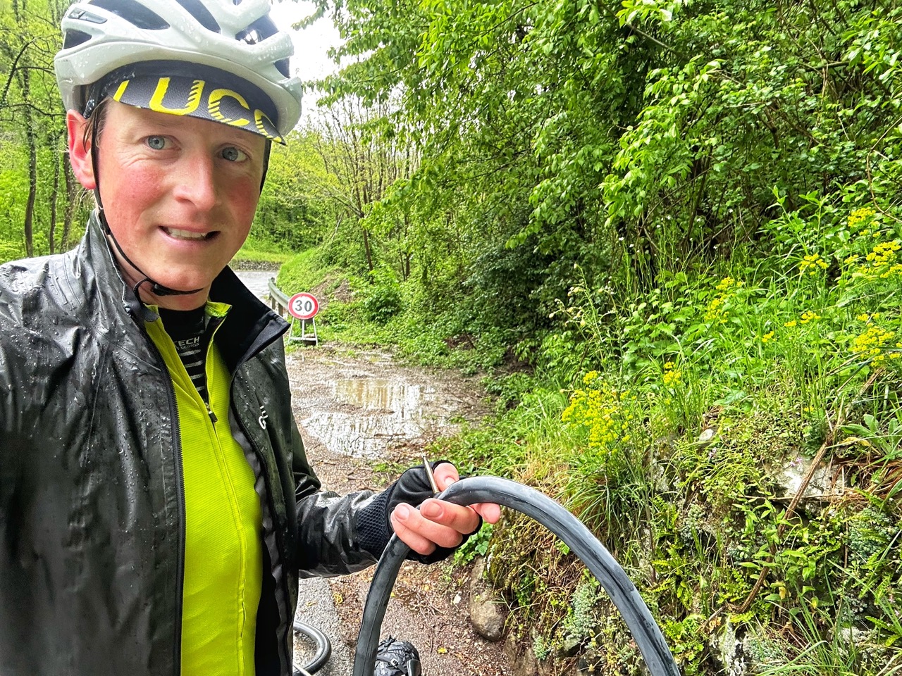 In het dal aangekomen is de regen van standje 8 naar 9 gegaan en tot overmaat van ramp rijd ik lek. Terwijl ik mijn band aan het verwisselen ben rijden talloze deelnemers me voorbij. Dat is frustrerend. Band is snel vervangen, alleen ben ik enorm afgekoeld dus wanneer ik weer opstap doe ik er een tandje bij tot ik weer warm ben. Zo haal ik weer een hoop mensen in.