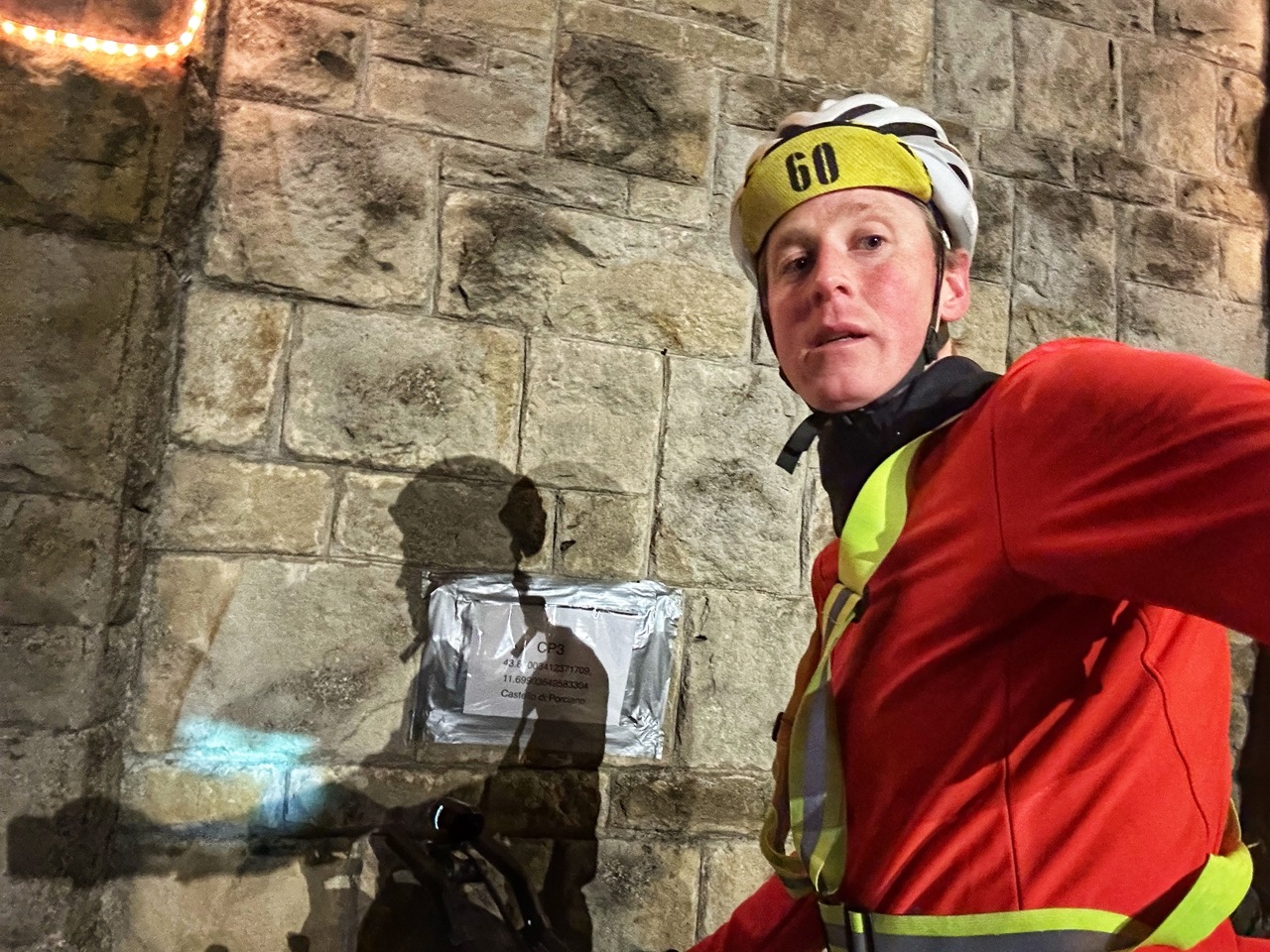 Eerst maar naar CP6, bovenop het kasteel van Radicofani. Ik rij de provincie Toscane weer in en het wordt meteen klimmen. Voor me zie ik een lampje van een fietser en ik gok dat Paul het is. Dit motiveert me om door te trappen, maar het blijken twee wielertoeristen die, wanneer ze mij zien, ook weer gaan versnellen. Ik laat ze gaan en vervolg mijn eigen weg.