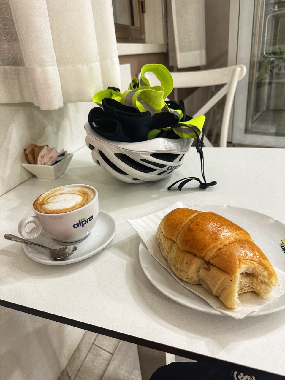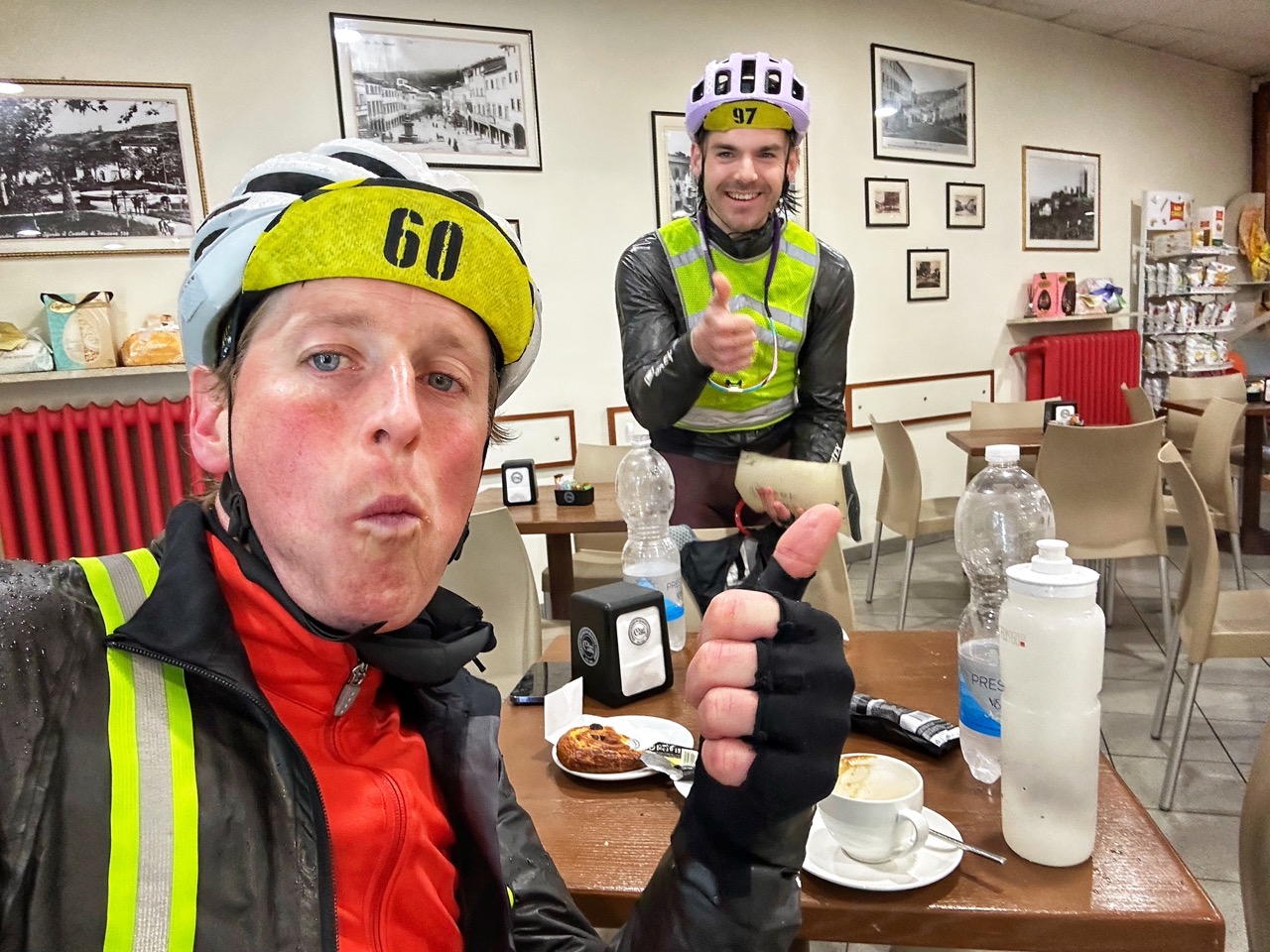 Ik besluit om in het dorpje te gaan kijken of daar een bar is waar ik mijn route kan maken en wat op kan warmen. Hier kom ik Alexander tegen die hetzelfde plan had. We ontbijten samen en maken grappen over rocketfuel wanneer we sportdrank in poedervorm in onze bidons doen. Uiteindelijk blijkt hij de beste fuel te hebben, want hij zal voor mij finishen.