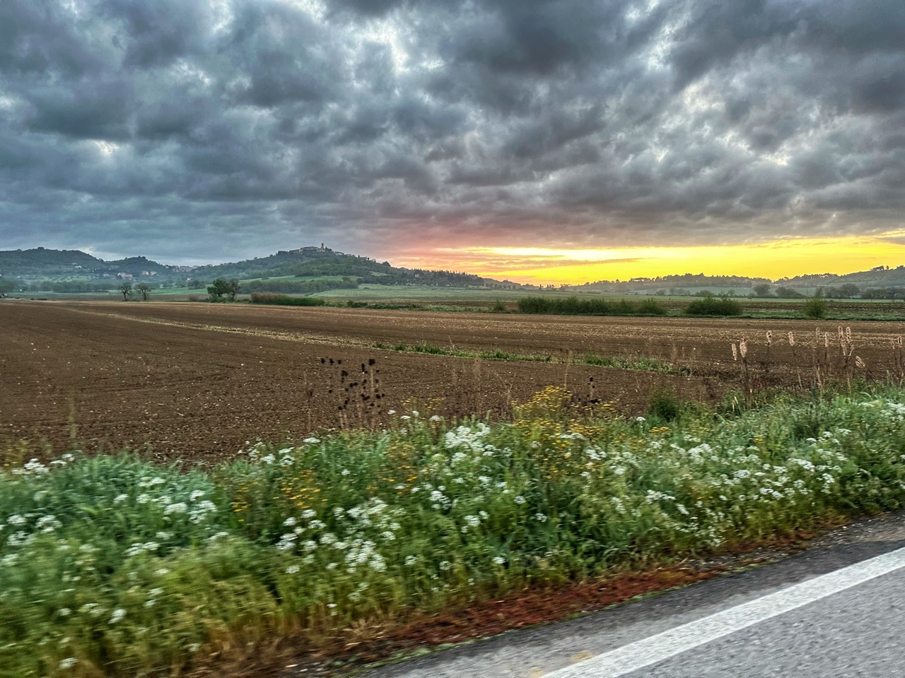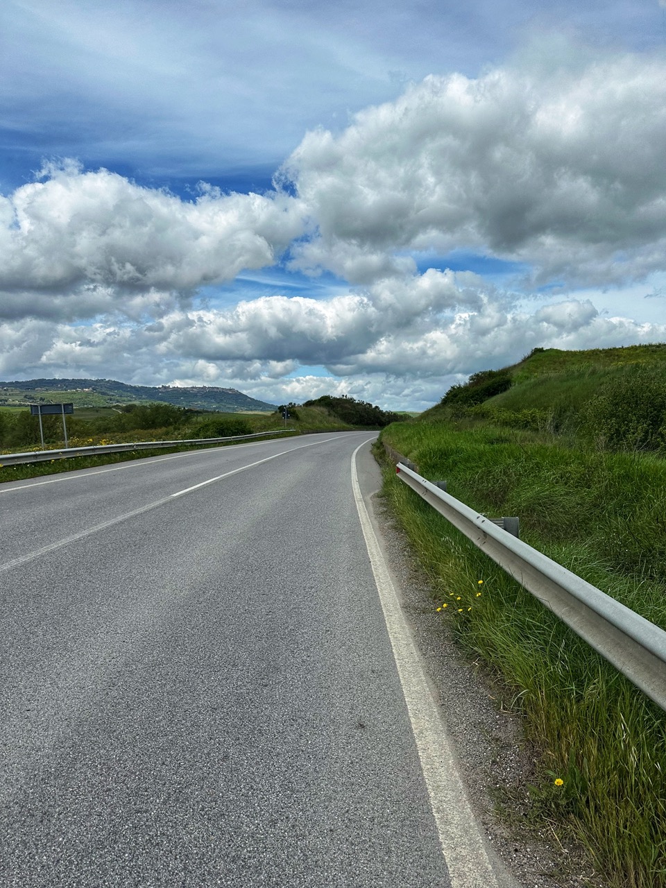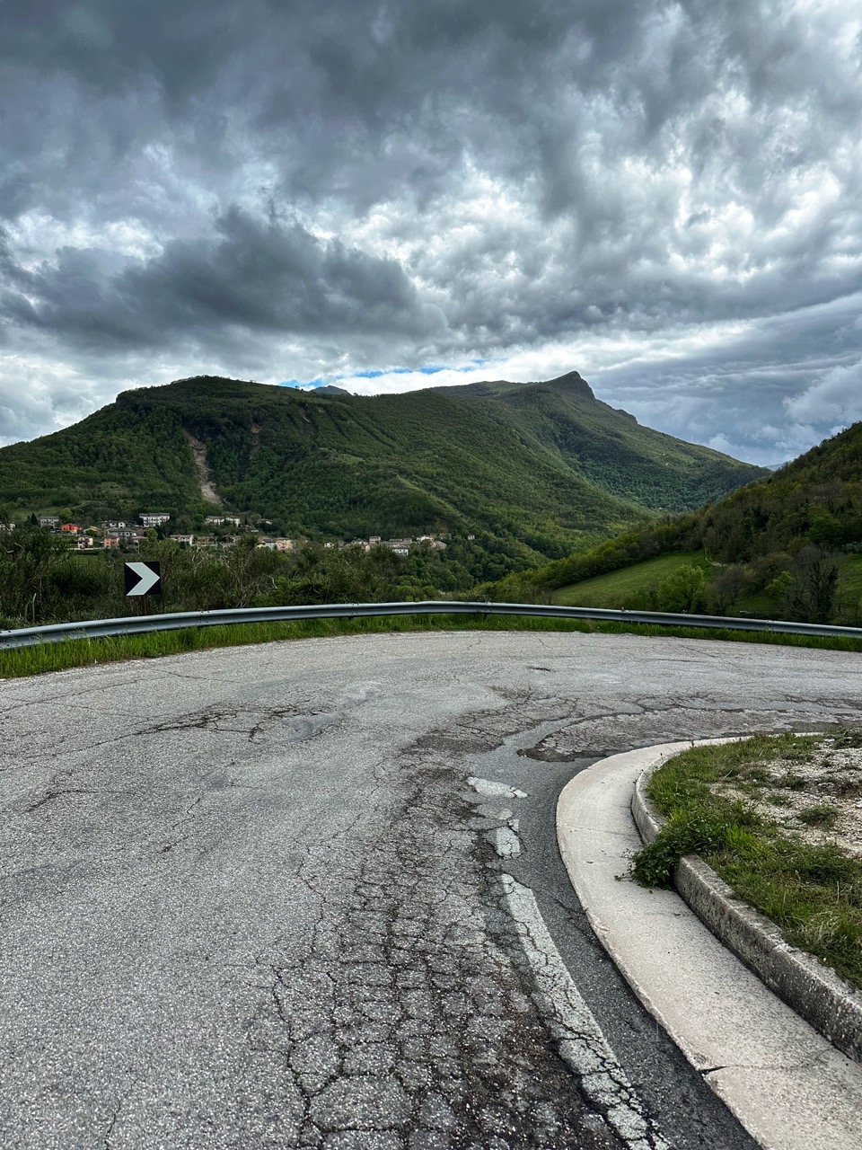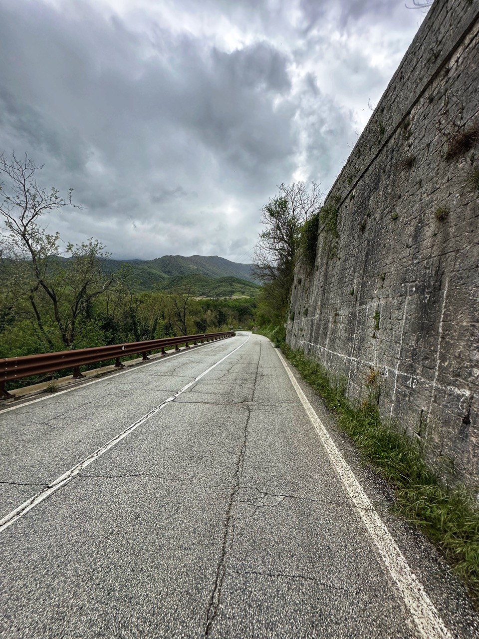 Tot Arezzo is het even doorbijten maar daarna wordt het rustiger. Zeker als ik de bergen weer in rijd. De pas richting Acqualagna is nergens echt steil en voor even is het droog. Net als ik daarvan begin te genieten komt het weer met bakken uit de lucht vallen. Bibberend kom ik boven en weer ga ik een koude afdaling in. Het kost veel energie en ik besluit bij een supermarkt boodschappen te doen en even wat anders te eten dan koekjes en reepjes, wat helpt. Na mijn supermarktbezoek neemt de regen af, en wanneer het droog is kan ik voor het eerst vandaag van het landschap genieten.