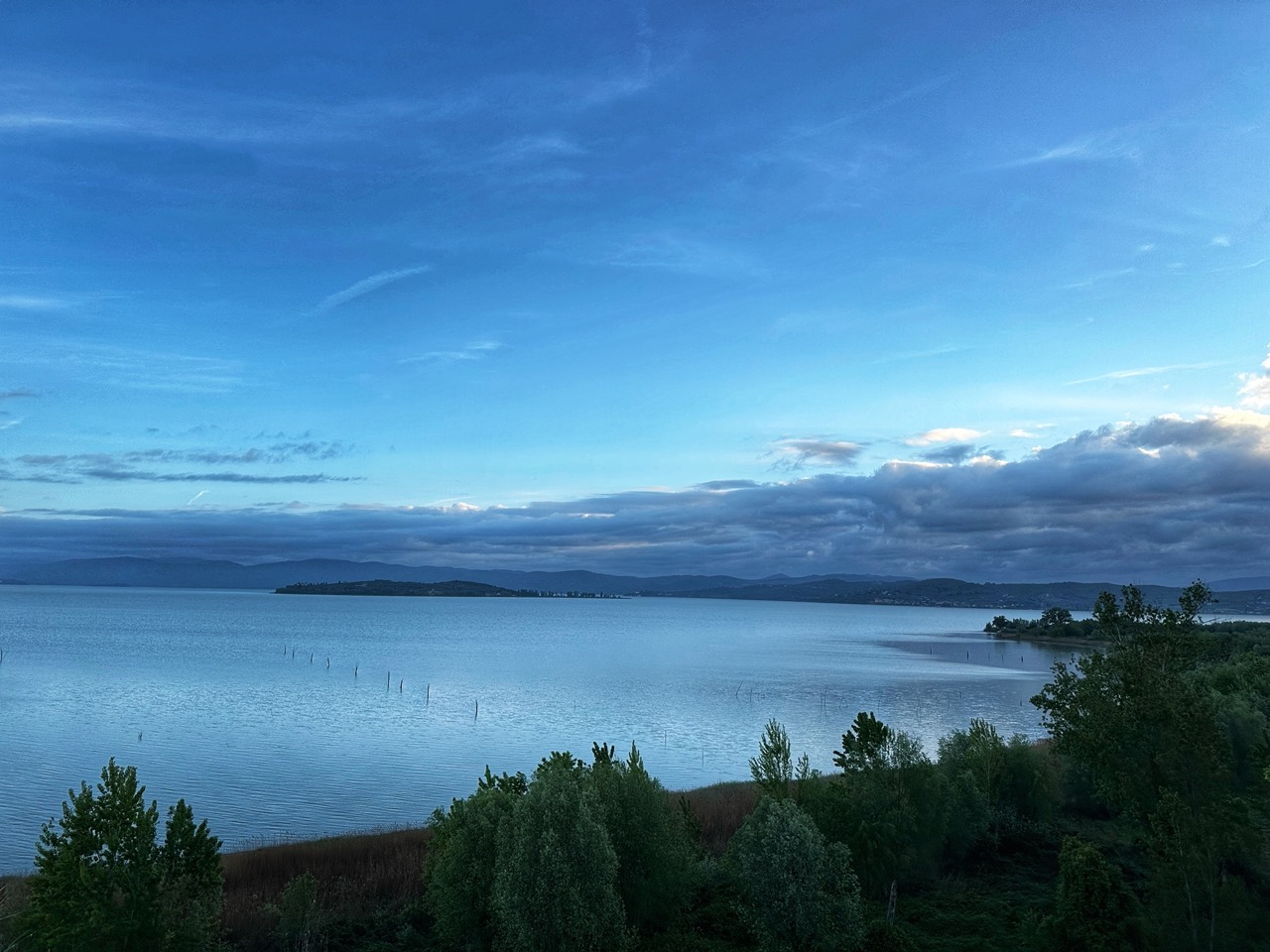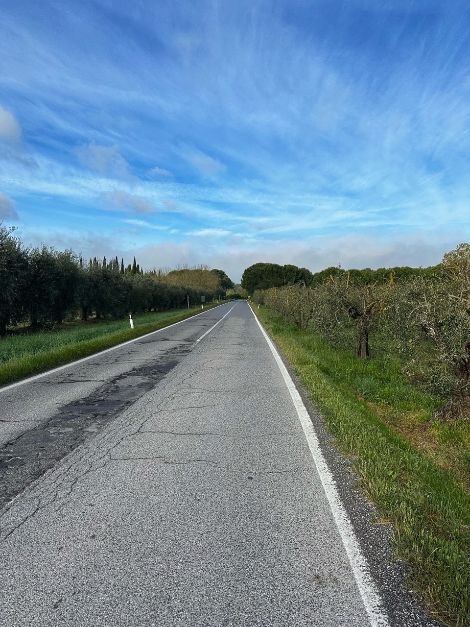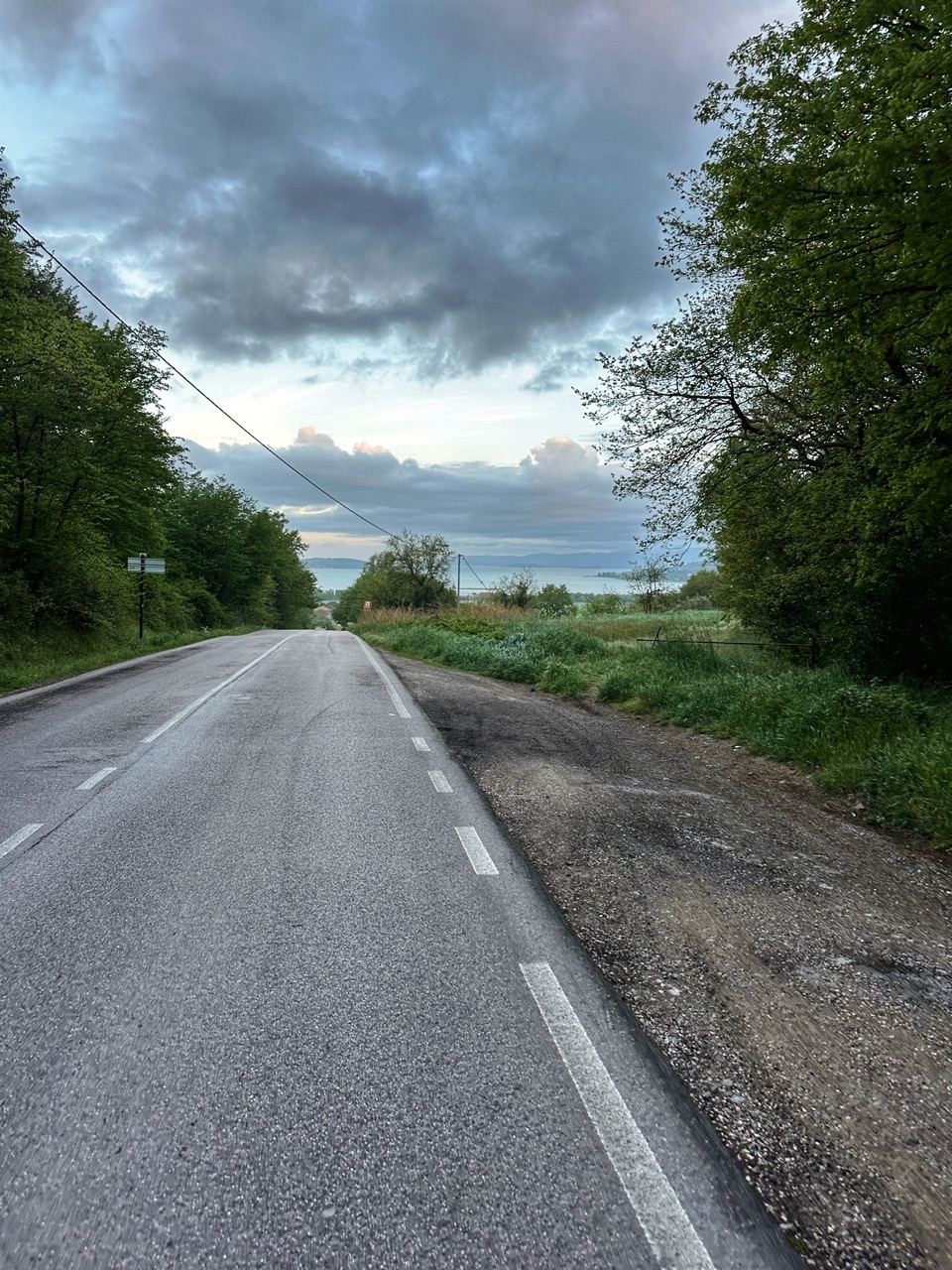 Ik rijd verder en kom bij het meer van Trasimeno, waar ik vorig jaar met Via ook al was. Het is de plek waar Hannibal zijn grootste victorie op de Romeinen vierde. Hier verruil ik mijn donsjas voor mijn gabba, maak ik snel een fotootje, en kijk ik op de tracker. Ik zie dat ik flink op ben geschoven en dat Paul voor me uit rijd. Hem kom ik vaak tegen en normaal gesproken fietst hij sneller, maar ik besluit de druk erop te houden en te zien of hij fouten maakt.