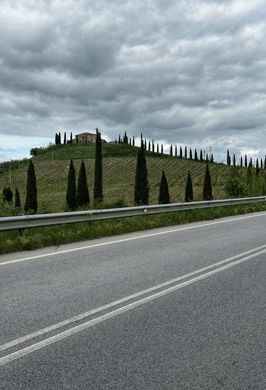Een lange afdaling door een groen Toscaans landschap volgt. Prachtige rolling hills in een groen gebied. Groen zover je kunt kijken en her en der boerderijen met klassieke oprijlanen met cypressen.