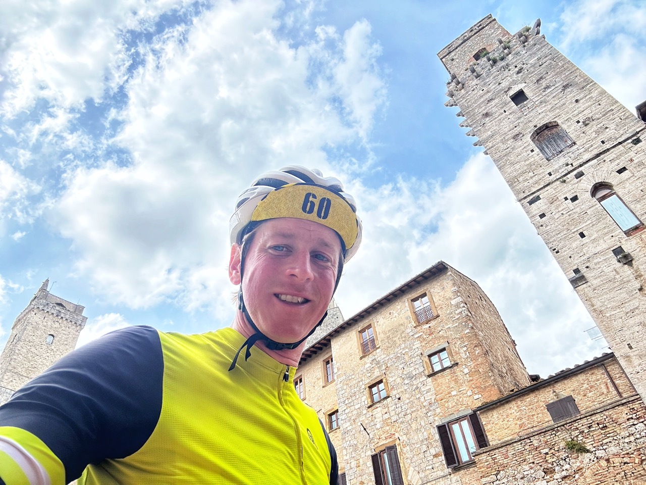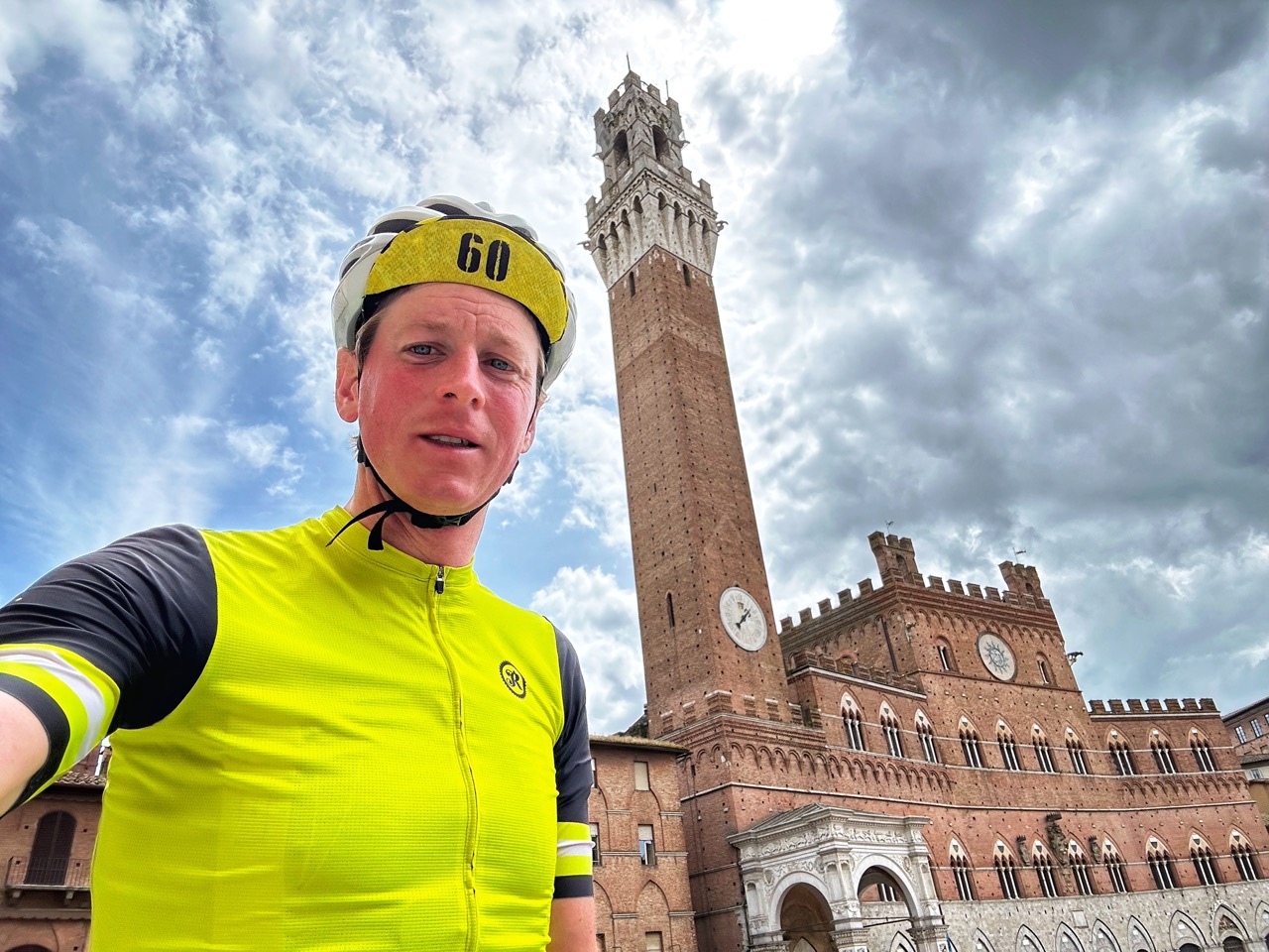 Via het Toscaanse landschap kachel ik naar Siena. Hier aangekomen krijg ik in een vlaag van verstandsverbijstering opeens de ingeving dat Piazza Del Duomo in Siena is en niet in San Gimignano. Ik dubbelcheck, en zie dat Julien die voor me zit inderdaad niet naar dit dorp rijdt en begin te twijfelen. Voor de zekerheid stuur ik de race organisatie een appje, dubbelcheck de coördineren, en besluit nu ik toch in Siena ben snel op het plein een foto to maken en dan voor de zekerheid toch ook naar San Gimignano te gaan. De coördinaten moeten leidend zijn.