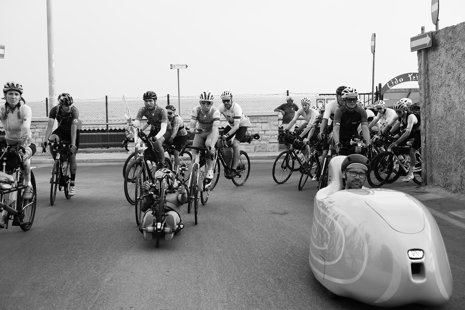 Door de vertraging van de politie mag ik een uur langer blijven liggen, maar heb zin om te gaan en ben voor de wekker wakker. Nu kan ik wel, voor de laatste keer, in alle rust ontbijten. Nog een dubbelcheck van mijn spullen en dan de deur uit. Onze BnB zit op minder dan een kilometer van de start, maar op dit kleine stukje komen wielrenners uit alle hoeken en gaten om zich te verzamelen op het dorpsplein. Hier is nog tijd om een tas in te leveren die mee naar de finish gaat, elkaar succes wensen en familie en vrienden uit te zwaaien. Meer dan genoeg tijd, want Italië zou Italië niet zijn als er niet nog meer vertraging zou zijn. Er worden grappen gemaakt of de organisatie wel genoeg steekpenningen heeft betaald en de nervositeit loopt op, maar uiteindelijk wordt er toch gestart.