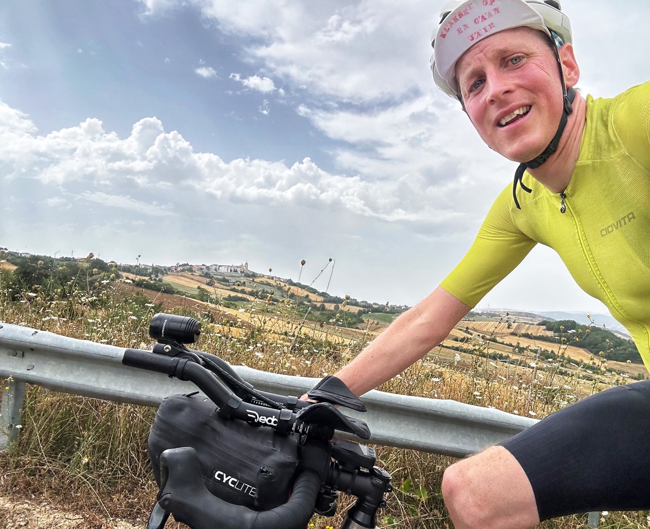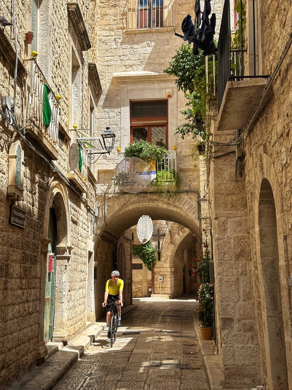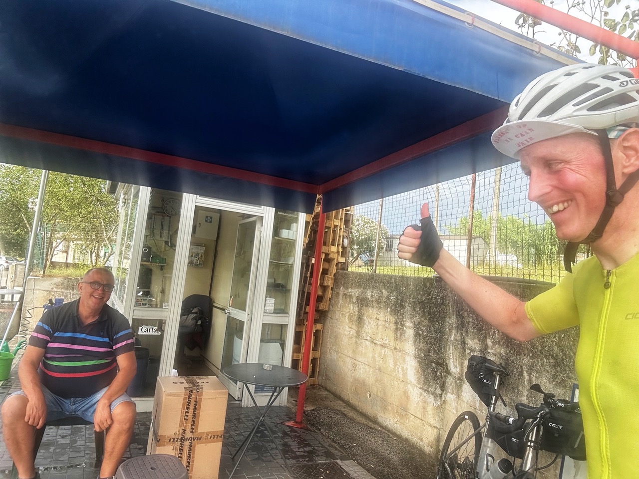 Als vakantie en meteen ook te acclimatiseren zijn we al een aantal dagen voor de start in Giovinazzo. Goed eten, nog een beetje hitte training en gewoon chillen. Elke dag komen er meer fietsers aan en mijn solo rondjes worden groepsritten. De dag voor de race is de bike check, die, omdat de gemeente het hek voor het park te laat opent, op z’n Italiaans, meteen een ruim uur vertraging oploopt. De fiets en papieren worden gecheckt en ik krijg mijn race petje en tracker. Verder is het een weerzien van een hoop andere racers en ontmoet ik een hoop nieuwe lui.
