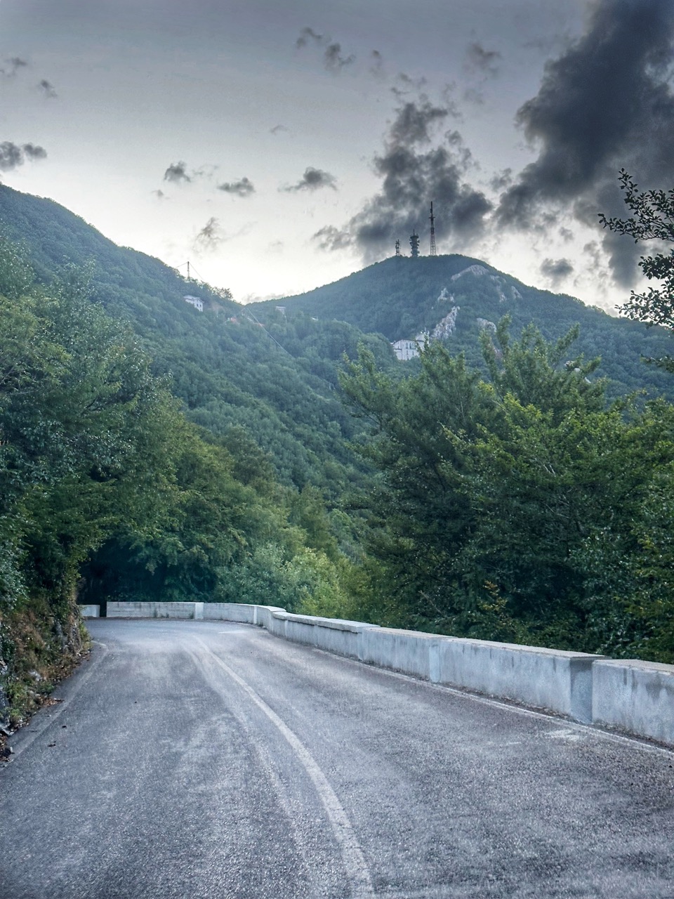Wanneer ik weg ben kom ik een andere deelnemer tegen. We hebben een korte babbel, maar laat hem snel achter want ik wil gate 2, Montevergine, voor het donker hebben gedaan. Mijn wahoo geeft aan dat de klim gaat beginnen. Rechts, links, omhoog. Bam, nee omlaag. Ik val. Mijn achterwiel slipt weg op het natte wegdek. Ik kan niet meer uitklikken en ben volkomen kansloos. De val is gelukkig zonder erg. Klein plekje op mijn hand is het enige, ook niets aan de fiets. Wel geschrokken. Het eerste stuk fiets ik wat angstig rond, maar op het moment dat de klim gaat lopen kom ik opnieuw in een ritme. Haarspelden die door de bossen naar de abdij gaan. Ik ben aan het genieten. Meermaals haal ik mensen in en tweemaal krijg ik de vraag of ik de KOM probeer te halen, maar als ik naar mijn cijfers kijk zit ik niet in het rood. Het gaat gewoon lekker.