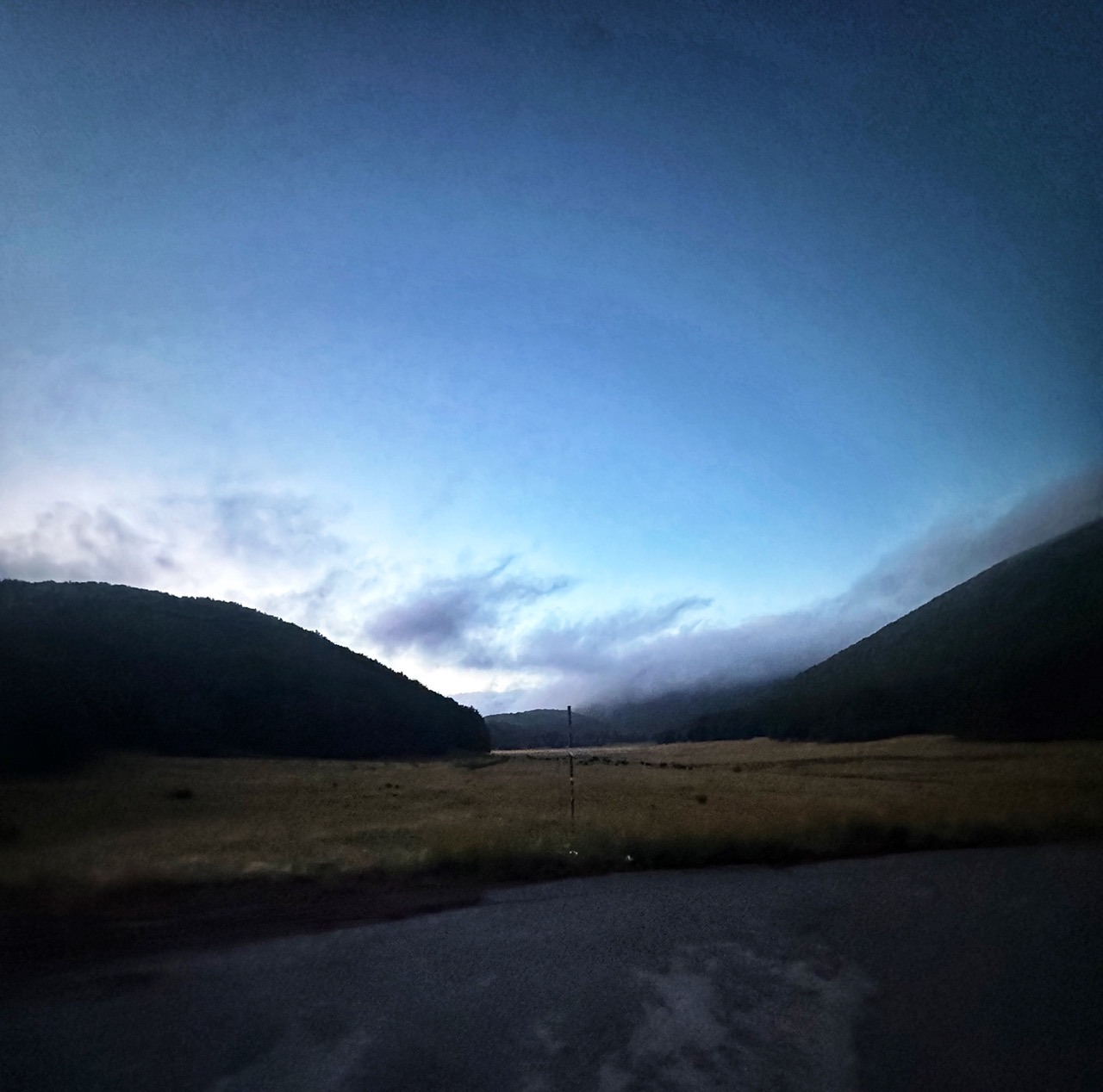 Op de top wordt het donker, de gate ligt net achter de top in een mistig grasveld. De afdaling die volgt is geen prettige. Allereerst vanwege herdershonden waarvoor al was gewaarschuwd, en vervolgens komt er een technische afdaling met zeer slecht wegdek, dat half nat ligt. Behoedzaam daal ik af, het lijkt uren te duren en echt snelheid maken kan niet. Te moeilijk en te slecht zicht.