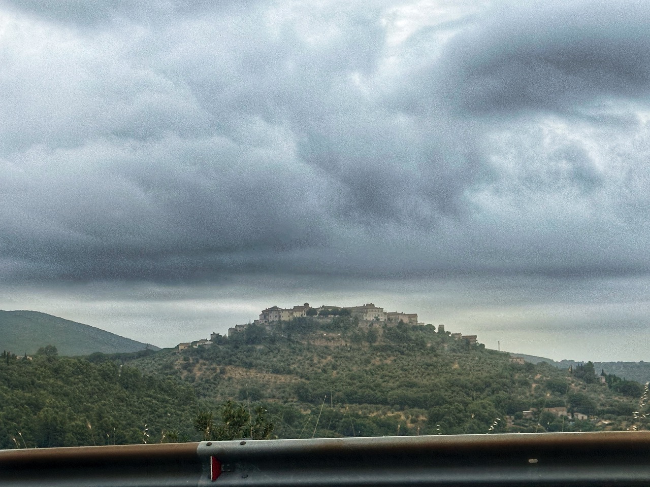 Wanneer ik de stad uit rijd kan ik weer rustig ademen. Ik ben niet alleen de stad, maar ook de bergen uit. Natuurlijk, het is Italië, en vlak is het niet, maar de bergen zijn heuvels geworden. Ondertussen nader ik Gate 5: Amelia. Hiervoor moet ik toch nog wel een heuvel op, maar geen col meer. Op deze klim is het is gaan miezeren, maar niet hard genoeg om regenkleding aan te trekken. Ik vind het ergens ook wel lekker, merk ik.