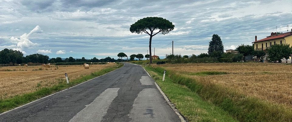 Vanaf hier weet ik dat, op een paar korte klimmen na, de route voor Italiaanse begrippen relatief vlak zal zijn tot de beklimming van de volgende gate. De miezer trekt weg en ik daal af naar de vlakte. Qua landschap een stuk saaier, qua progressie een stuk beter. Bijna dertig vlakke kilometers gaan nu volgen.
