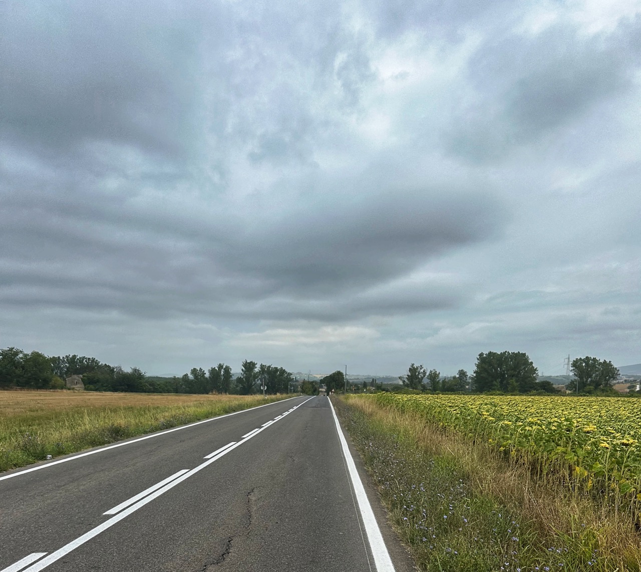 Na Orvieto komt een een klim naar het volgende dal, om daar wederom een lang relatief vlak stuk te krijgen. De klim is mooi, maar het vlakke landschap daarna saai. Ik weet dat dit ongeveer tachtig kilometer gaat duren, dus ik besluit boodschappen te doen en met voldoende eten aan boord wil ik proberen zo efficiënt mogelijk dit stuk door te komen. Fietsend gaat me dit wel lukken, maar alle efficiëntie in de supermarkt ontbreekt. Ik sta voor een kassa waarbij het bonnetje niet klopt van een van mijn voorgangers, de manager komt erbij, er wordt drama gemaakt, en alle klanten die staan te wachten moeten het maar aanzien. Met haast lijken vijf minuten al snel vijftien minuten, maar dit leek wel uren te duren. Op het moment dat ik aan de beurt ben plaatste de caissière ook nog een bordje dat er alleen met cash betaald kon worden. Waar ik normaliter een geduldig persoon ben, verloor ik nu al mijn geduld, en in plaats van te proberen toch een oplossing te vinden ben ik weggelopen. Super dom, want dit is gewoon verloren tijd.