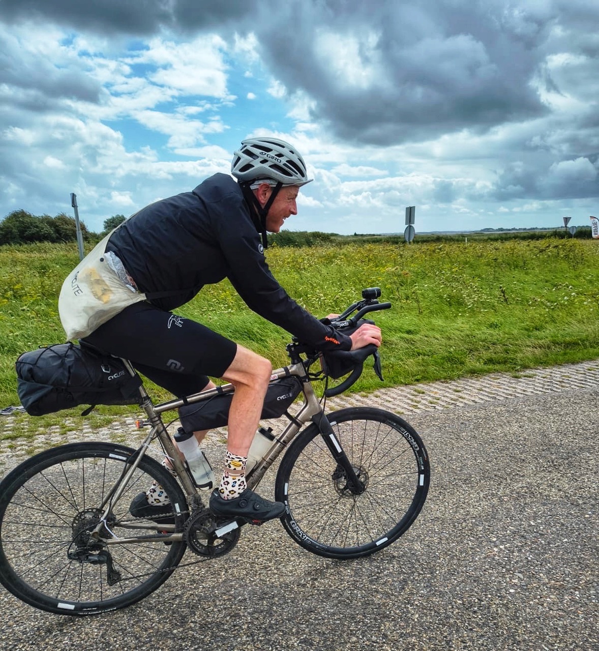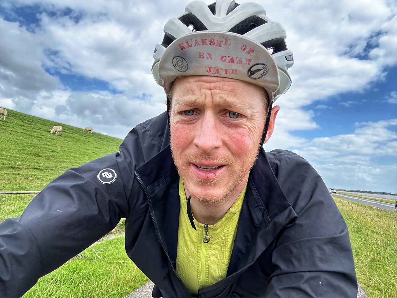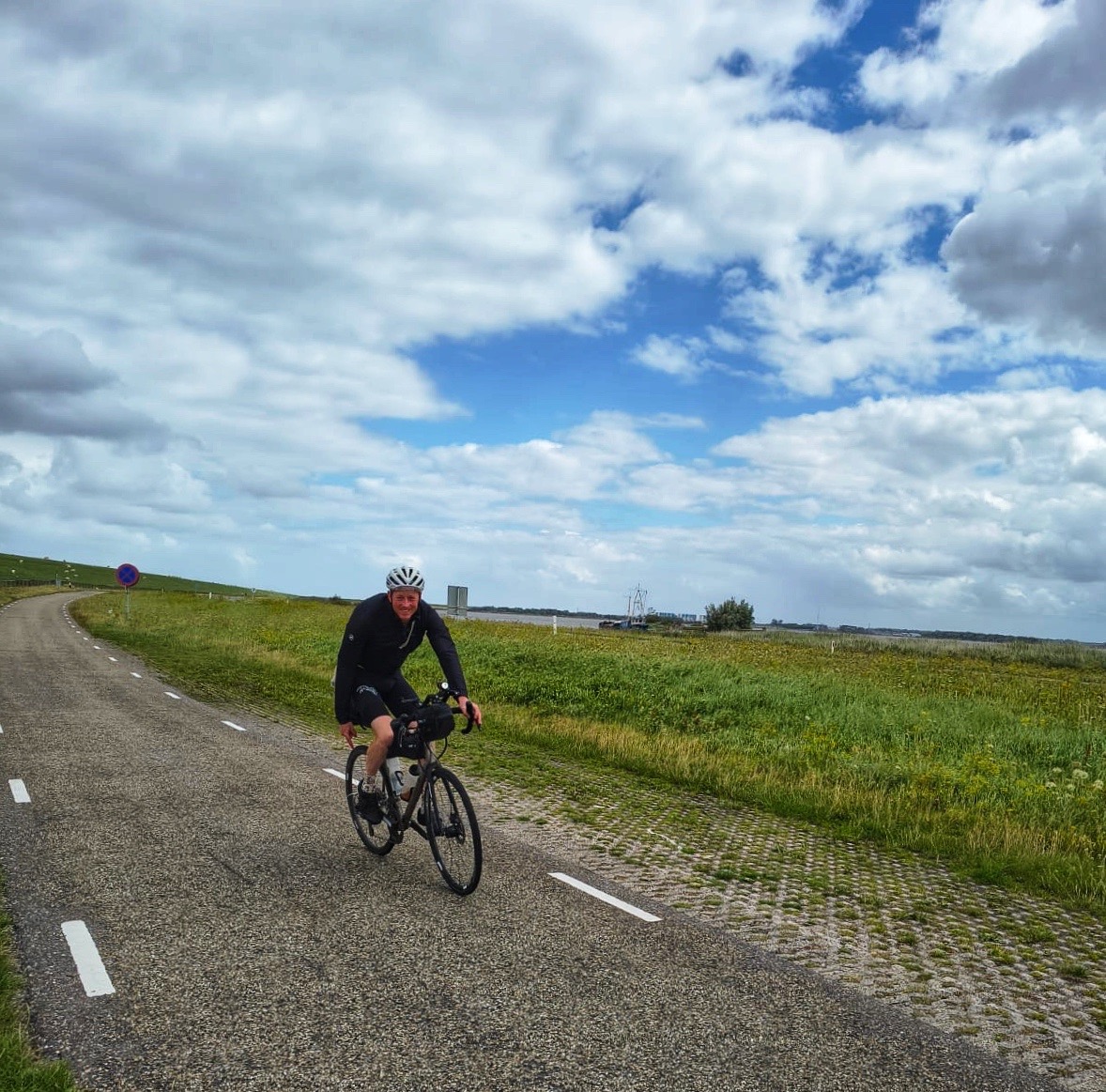 Wanneer ik dan toch de overkant bereik komt Wout me nog even aanmoedigen. Hij komt van de dijk afgerend en roept me nog wat toe wat ik nauwelijks hoor met de wind in mijn gezicht. Het einde van de dijk is het punt waar de route langzaam maar zeker naar het zuiden draait. Langzaam, de wind is is niet meer pal tegen maar schuin tegen. De kilometers per uur gaan een beetje omhoog, maar daar is alles mee gezegd.