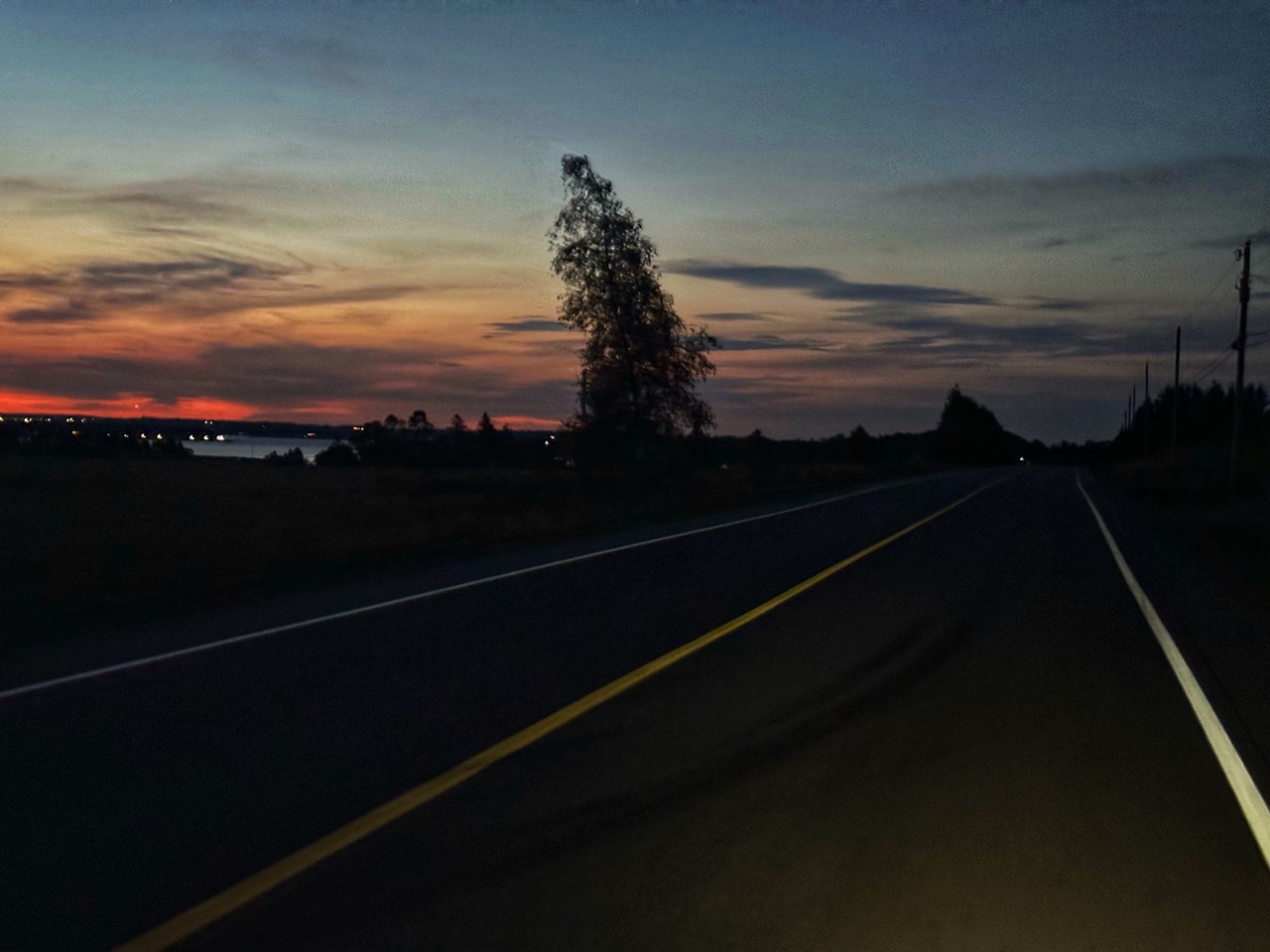 Nadat ik om de baai heen ben volgt een lang stuk naar het oostelijkste punt van het eiland. Links van me de zee, die in het begin van dit stuk af en toe zichtbaar is, rechts van me bossen. Het is een eenzame weg en als ook de zee niet meer zichtbaar is door bebossing wordt het saai. Af en toe kom ik een plaatsnaambordje tegen maar van een dorp is nooit te spreken. Er staan dan enkele huizen bij elkaar. Deze eenzaamheid heeft wel wat, eindeloos rechtdoor rijden wetende dat ergens het einde van het eiland is. Waar in de middag de zon scheen, trekt het nu weer dicht, dit onderstreept het uitgestorven gevoel. Zeker als er lichte miezer uit de wolken begint te vallen. Ondertussen gaat achter me de zon onder en ik ben bang dat wanneer het verder afkoelt de miezer regen wordt, dus voor de zekerheid doe ik mijn regenjas weer aan, maar gelukkig zet het niet echt door en lijkt het plaatselijk.