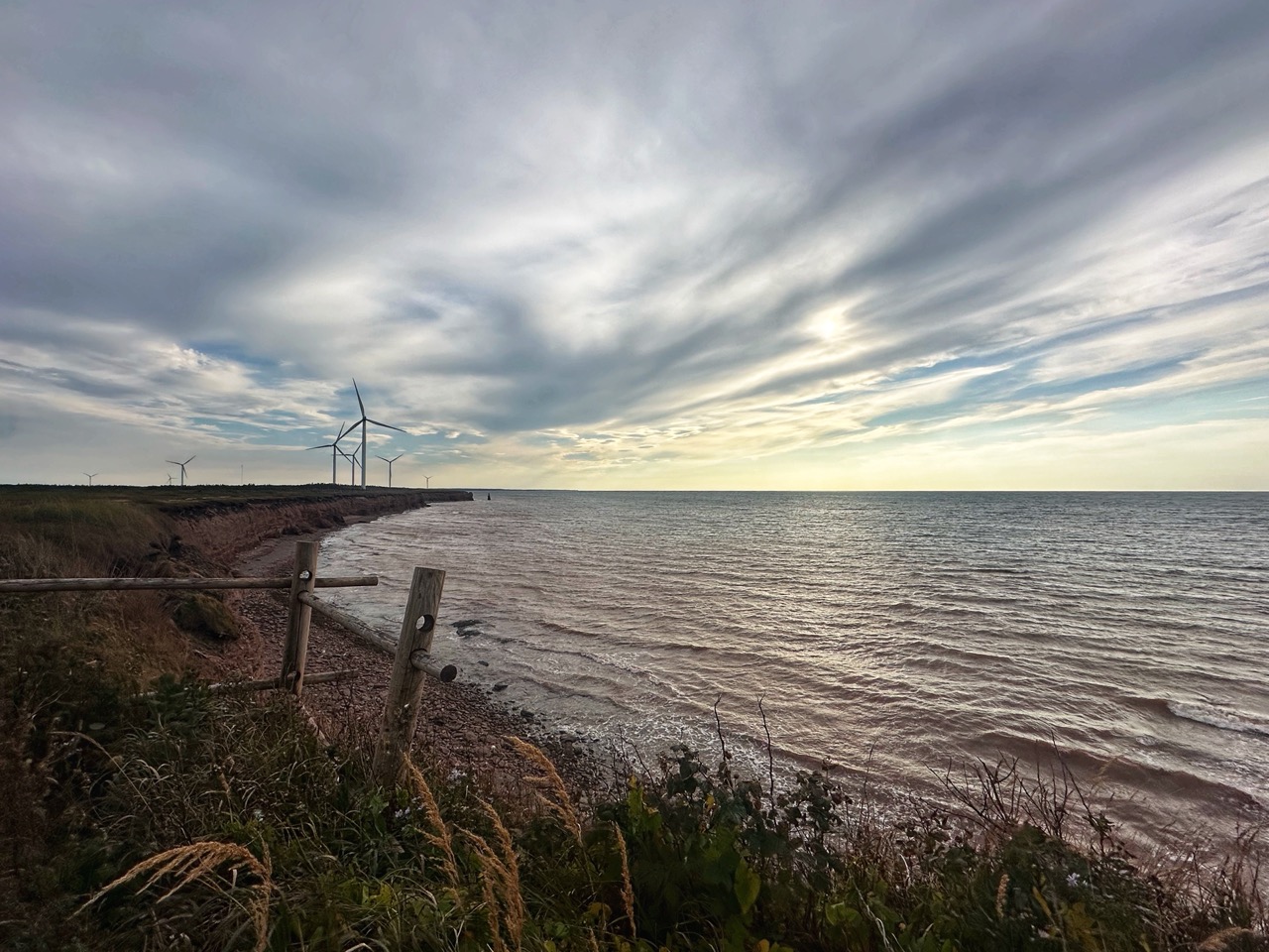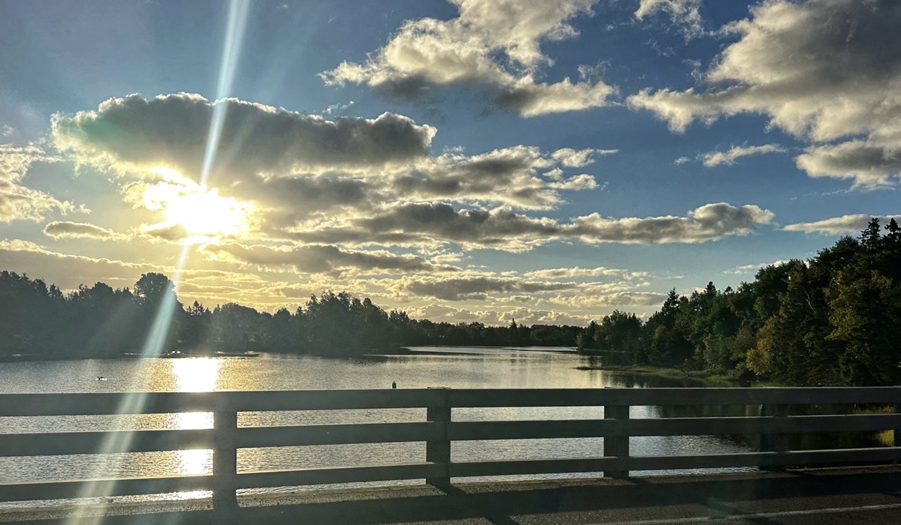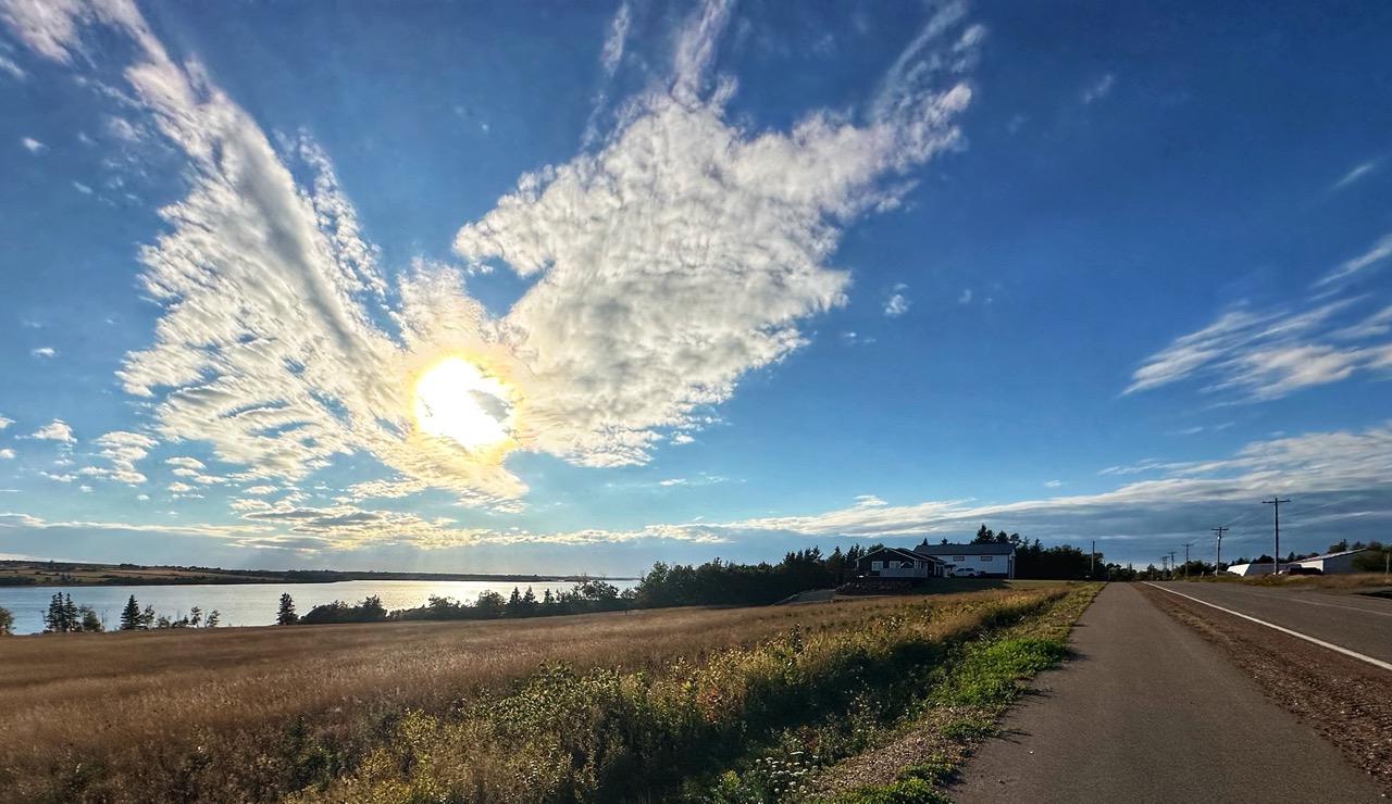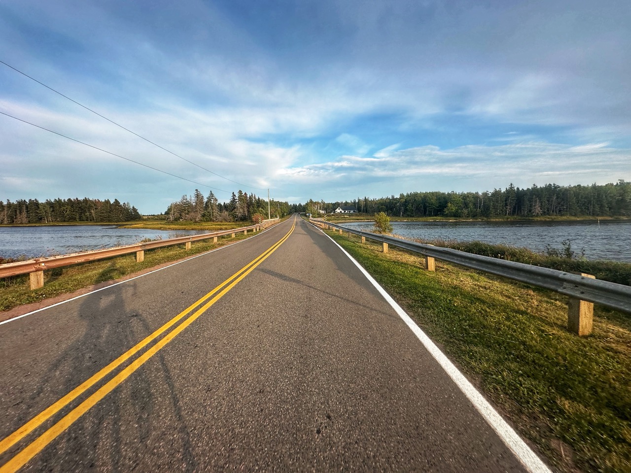 Voor ik het weet ben ik de stad uit en rijd ik in het donker. Nauwelijks verlichting, alleen de verlichting van de stad, die steeds kleiner wordt. Charlottetown ligt in een baai, centraal in een soort van kruising van water. Dat betekent voor het eerste deel van de route een soort van zig-zag hieromheen. Eerst steek ik North River over, daarna West River. Erg fantasierijk zijn de namen niet. Gelukkig is het wel mooi, zelfs in het donker. Mooier wordt het als ik een klein stuk naar het oosten rijd en de zon opkomt. Vanaf Fairview tot Rocky Point begeef ik me op een lange rechte weg met “rolling hills”. Het lijkt eindeloos rechtdoor, maar telkens als ik omhoog ga zie ik delen van de zonsopkomst. Prachtig begin van de dag.