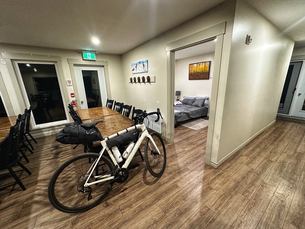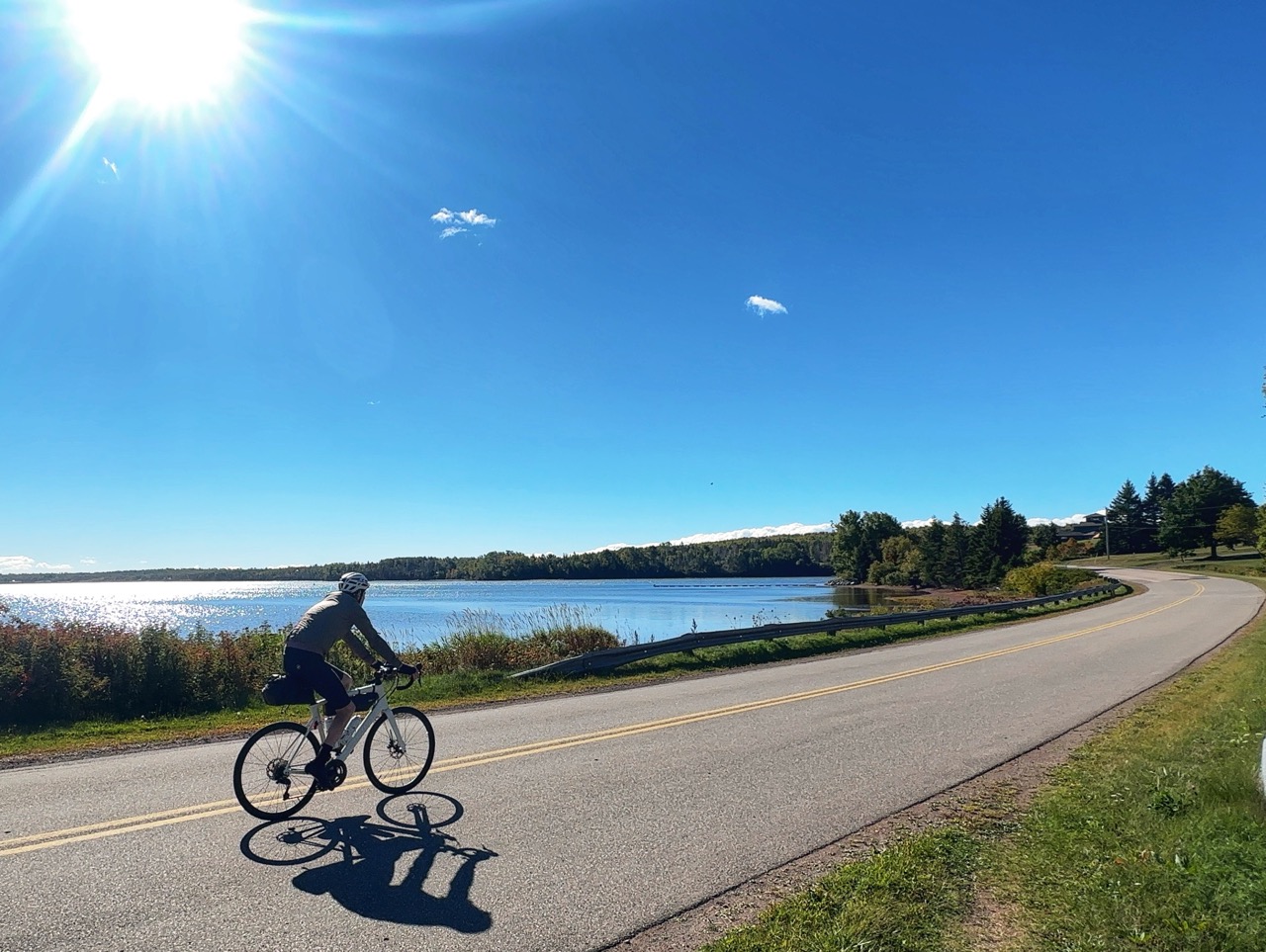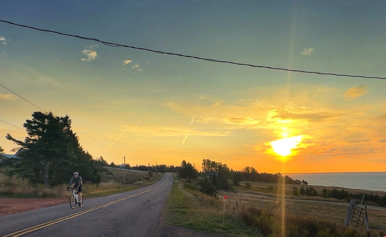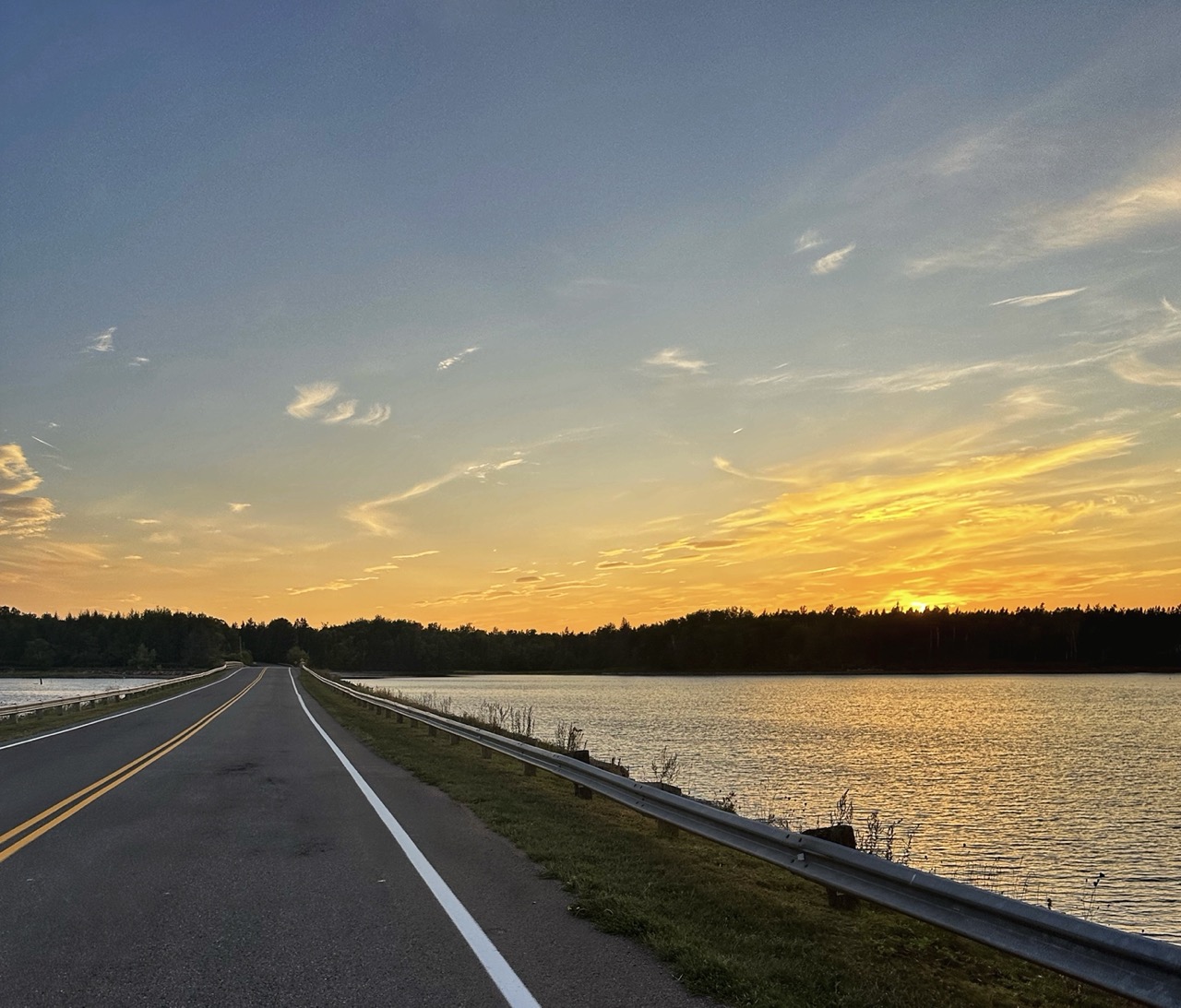 Vanaf hier is het nog een uur of anderhalf fietsen naar Alberton, waar mijn accommodatie is. Alleen de meewind wordt nu tegenwind, maar omdat het zonnetje weer tevoorschijn komt is er eigenlijk weinig te klagen. Het zijn ook weer meer bossen dus heel hard staat de wind niet tegen. Wel komt het einde in zicht en begin ik me te verheugen op het avondeten. Terwijl de zon langzaam onder gaat kom ik dichterbij. Op plekken die open zijn kan ik genieten van de zonsondergang en nét voor het donker kom ik aan bij mijn accommodatie. Kildare Lodge, zo heet het. Het is een groepsaccommodatie voor liefhebbers van buitensport. Naast de accommodatie bieden ze ook fiets, kajak, en sup-verhuur aan voor groepen. Ik ben er deze nacht alleen, de deur is open, ik krijg een appje dat ik gerust mijn fietskleding mag wassen en dat het eten de koelkast staat. Na me geïnstalleerd te hebben vind ik twee kreeften, aardappels, en koolsalade in de koelkast waar ik me tegoed aan kan doen. Wat een hemels verblijf. Met gevulde maag en een schoon pakje naast me op de stoel val ik tevreden in slaap.