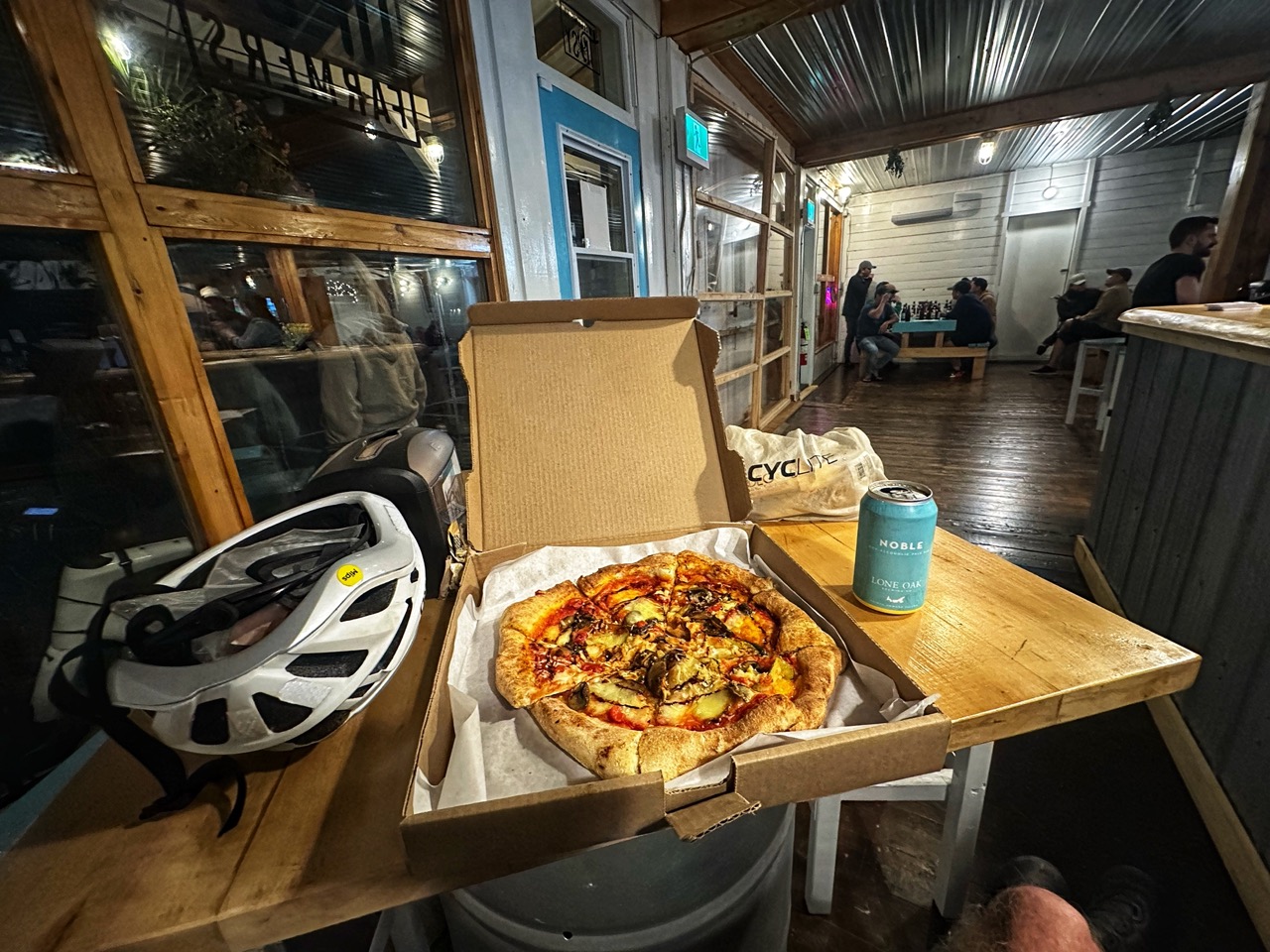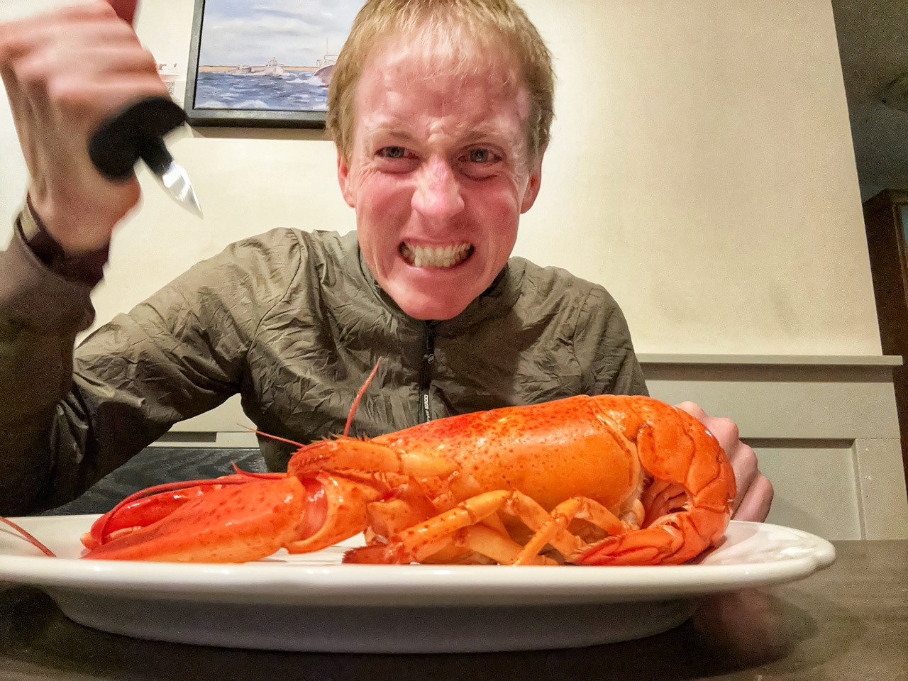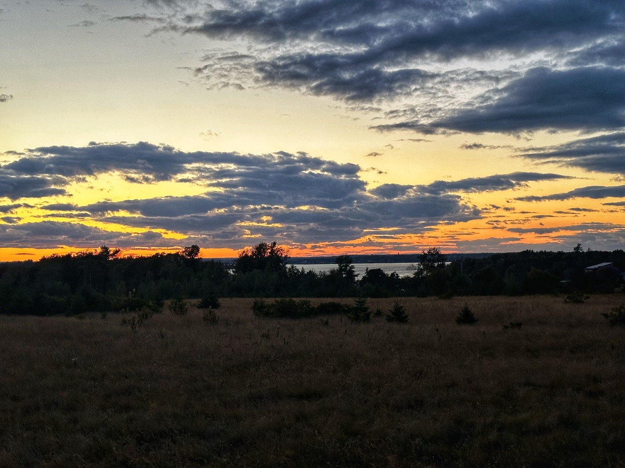 Vanaf hier is het nog een uur of anderhalf fietsen naar Alberton, waar mijn accommodatie is. Alleen de meewind wordt nu tegenwind, maar omdat het zonnetje weer tevoorschijn komt is er eigenlijk weinig te klagen. Het zijn ook weer meer bossen dus heel hard staat de wind niet tegen. Wel komt het einde in zicht en begin ik me te verheugen op het avondeten. Terwijl de zon langzaam onder gaat kom ik dichterbij. Op plekken die open zijn kan ik genieten van de zonsondergang en nét voor het donker kom ik aan bij mijn accommodatie. Kildare Lodge, zo heet het. Het is een groepsaccommodatie voor liefhebbers van buitensport. Naast de accommodatie bieden ze ook fiets, kajak, en sup-verhuur aan voor groepen. Ik ben er deze nacht alleen, de deur is open, ik krijg een appje dat ik gerust mijn fietskleding mag wassen en dat het eten de koelkast staat. Na me geïnstalleerd te hebben vind ik twee kreeften, aardappels, en koolsalade in de koelkast waar ik me tegoed aan kan doen. Wat een hemels verblijf. Met gevulde maag en een schoon pakje naast me op de stoel val ik tevreden in slaap.