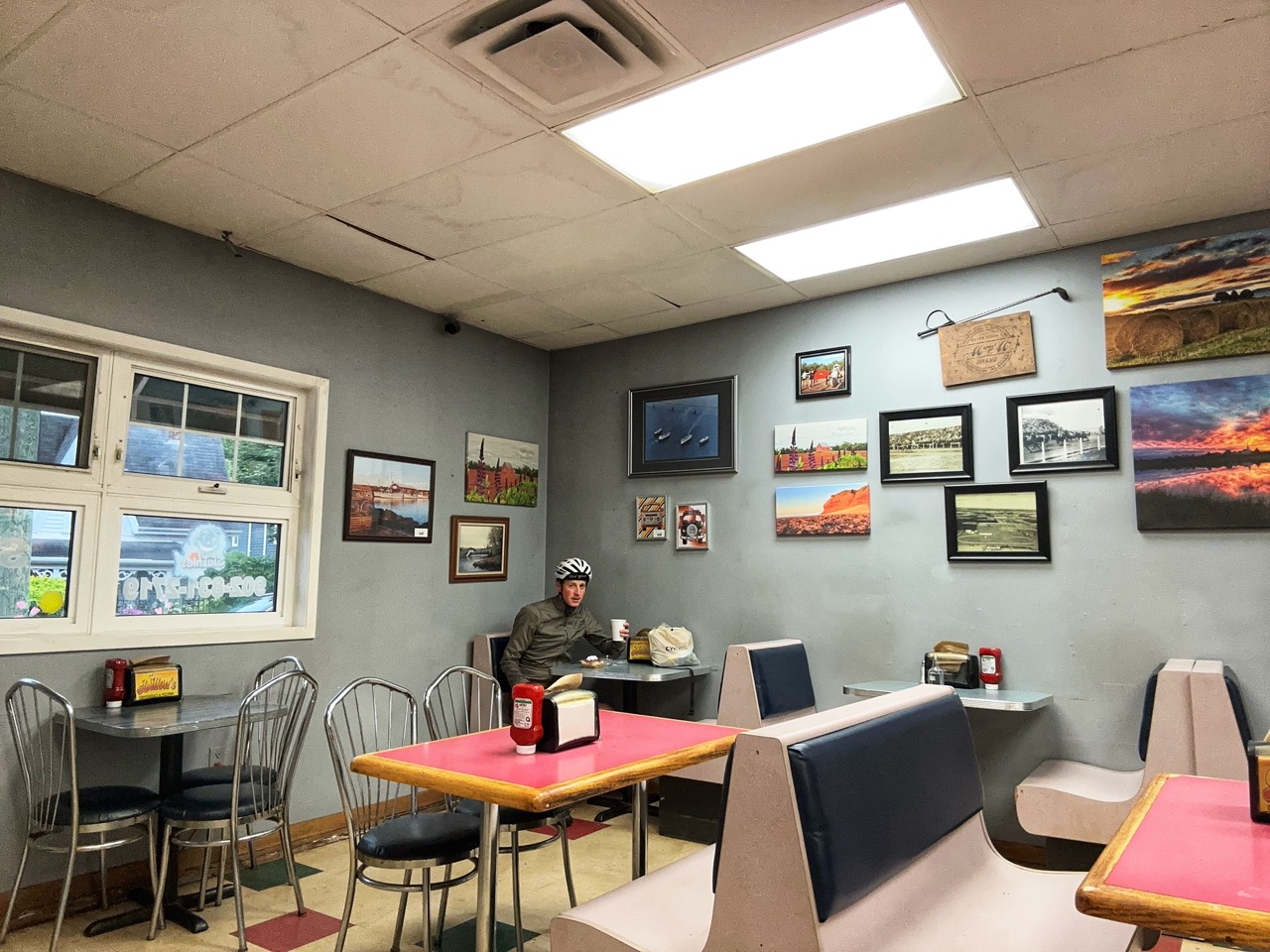 Dit stuk bestaat uit een combinatie van trails en highway. Beide ongeveer even druk. Er zijn maar enkele auto’s op de weg en op de trails zijn aardig wat zaterdagse fietsers. Boomers op e-bikes voornamelijk. Her en der een brug met uitzicht over het water breekt de lange rechte wegen. Aan het einde van de trail ligt Montague, een plaatsje met veel bedrijvigheid. Overal zijn yard sales en zoals een Noord-Amerikaan betaamt ga je er met de auto heen. Na een hoop uitgestorven wegen weet ik me opeens in een file van koopjesjagers. Na het dorp is het weer rustig, al blijf ik me verbazen hoe veel yard sales er zijn. Ik vraag me af of dit een zaterdags ding is of dat er meer achter zit.