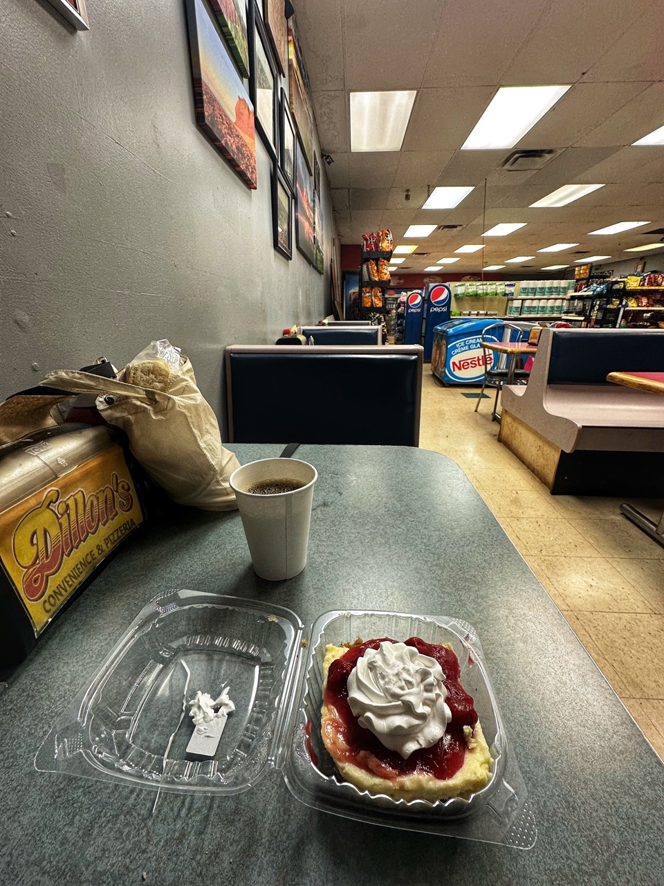 Inmiddels is het helemaal licht geworden en begin ik trek te krijgen. Ik heb zin in koffie en wat te eten, maar ik ben in een uitgestorven gebied heb en geen idee wanneer ik wat tegen ga komen. In tegenstelling tot gisteren heb ik dat voor vandaag niet uitgezocht. Reepjes heb ik nog genoeg en hierop kan ik als het moet nog uren voort, maar even wat anders eten en een kop koffie zou lekker zijn. Na een uur of wat hierover te hebben gefantaseerd kom ik in Tyne Valley een winkel tegen. Het assortiment is nét wat groter dan de convenient store van gisteren, maar daar is alles mee gezegd. Ik mag het doen met een lekkere slobberbak, iets dat voor kersentaart door moet gaan en een muffin. In de dining van deze winkel peuzel ik het op. Echt lekker is het niet, maar het vult de maag en wanneer ik weer verder rijd merk ik dat het me toch goed heeft gedaan.